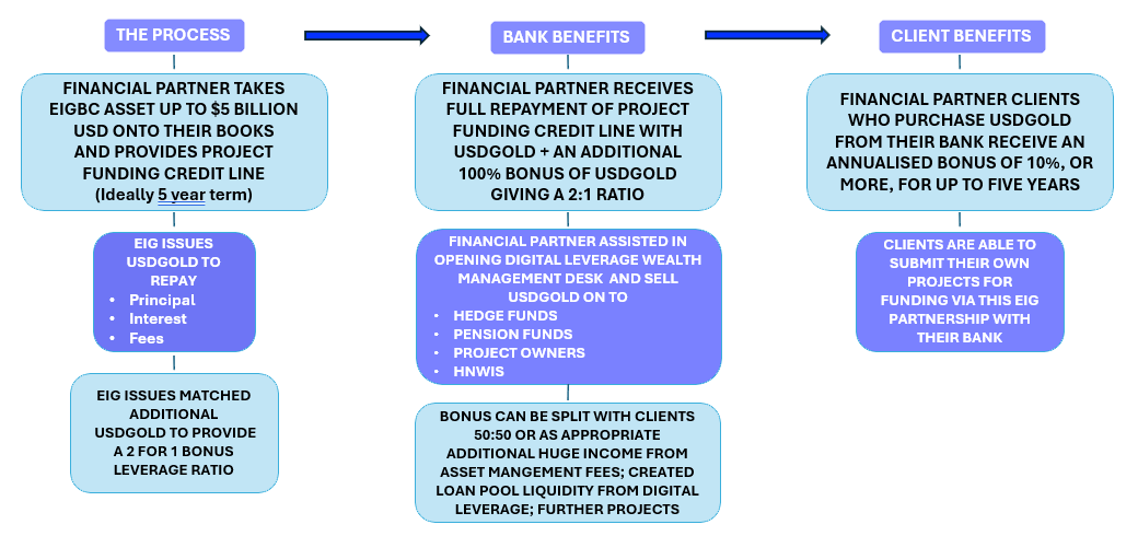 Currently, EIG Global Trust is offering new partners a 2 for 1 match solution where in addition to issuing EIGBC to partners without any purchase requirement or debt (booked as an asset on the balance sheet), we will “match” that amount with USDAU issuance further enhancing the balance sheet and leverage ratios. We are able to commit to this industry leading mechanism because of our unique gold-backed stablecoins and taking a long-term approach. Partner banks benefits include increased project returns since more credit lines can be established and creates a new digital asset for their clients who can invest their fiat balances into the additional USDAU provided by EIG Global Trust. Note: EIGBC cannot be resold or transferred to clients as its primary purpose is to provide digital asset collateral. We do allow EIGBC to be transferred or split into multiple wallets within the partners domain.