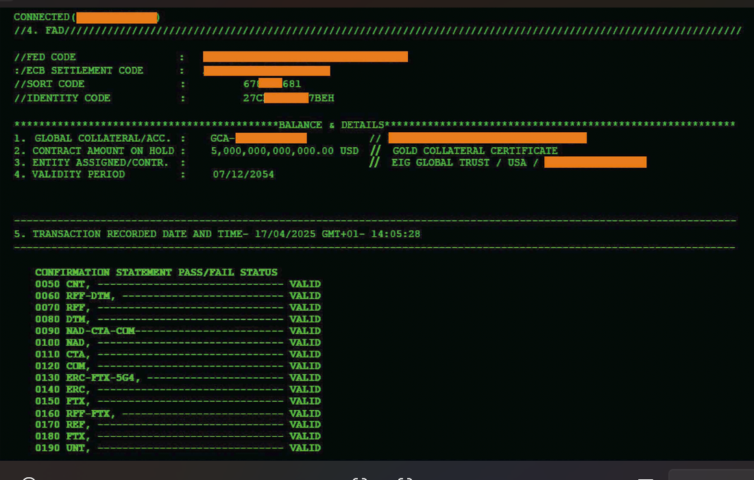 The screenshot exhibit below show $5 trillion Negotiable Gold Certificate of Collateral recorded in a US Federal Reserve account with EIG Global Trust as the “Entity Assigned”.